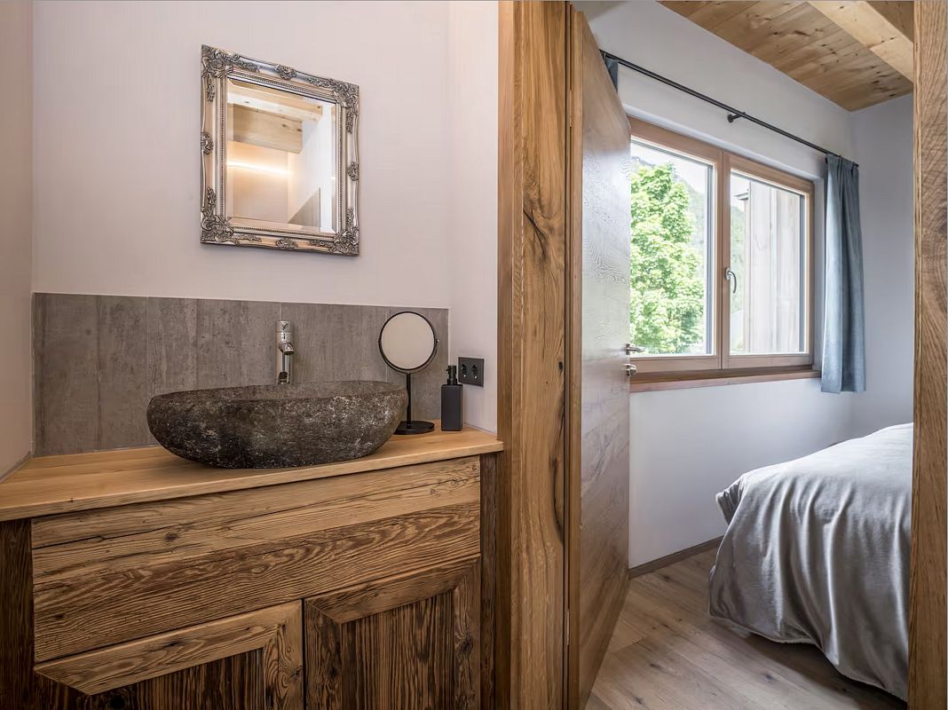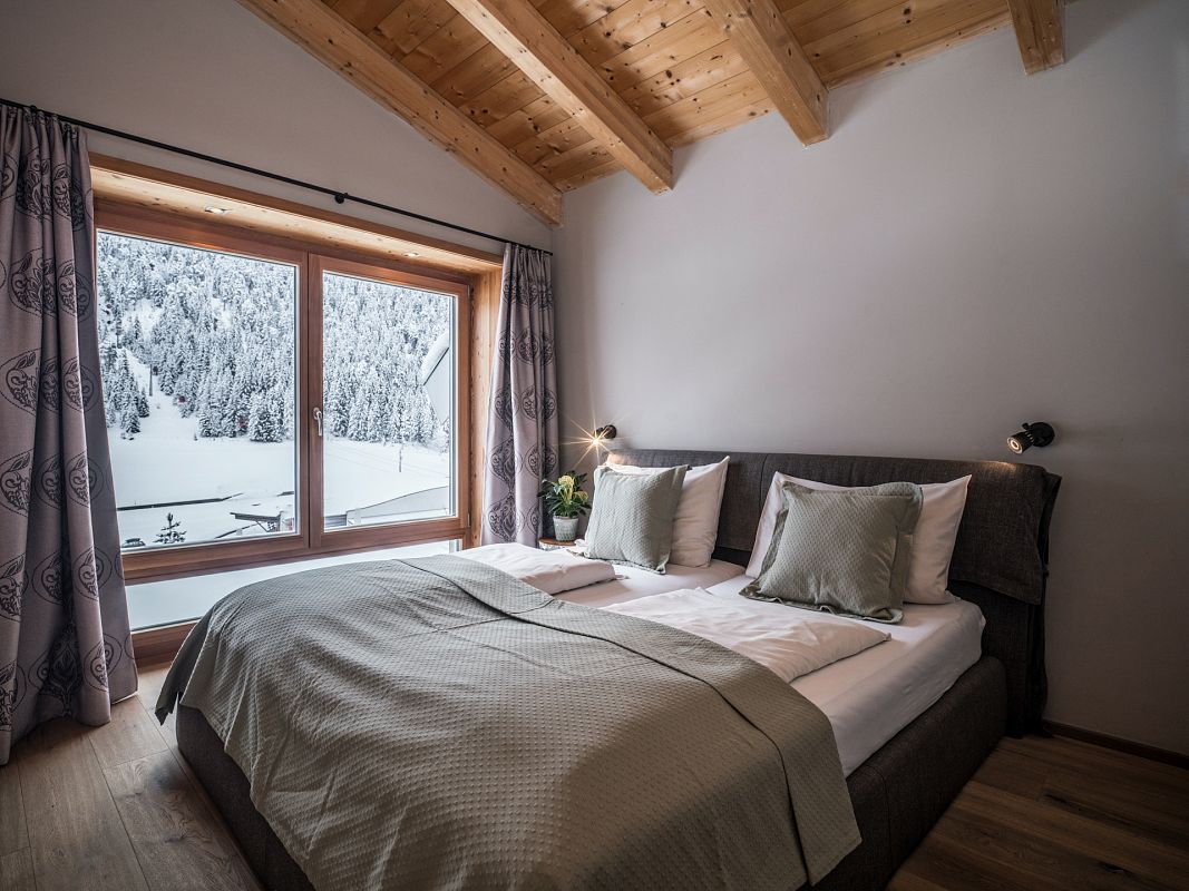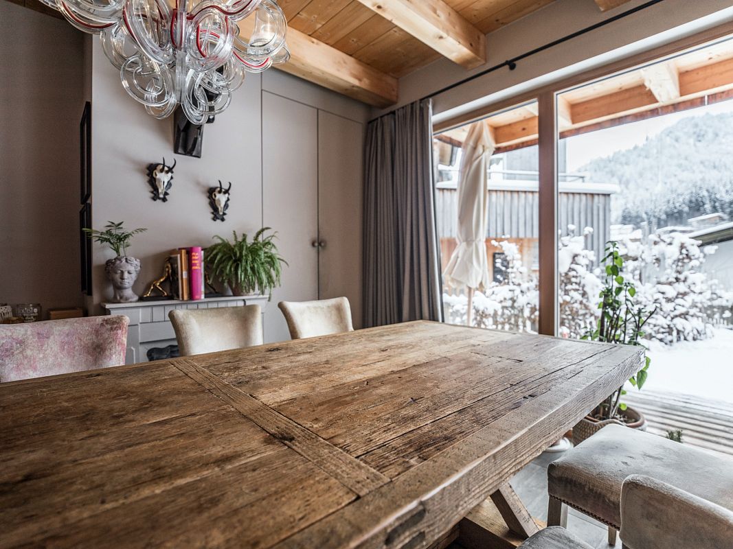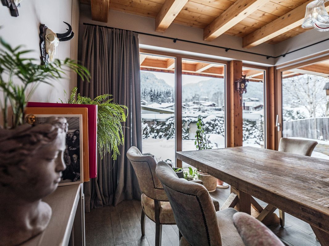 Das großzügige Wohnzimmer bietet durch Panoramafenster atemberaubende Ausblicke auf die majestätischen Tiroler Alpen. Das Anwesen bietet Platz für Familien und Freunde bis zu 6 Personen. Ausgestattet mit zwei Doppelzimmern sowie einem charmanten Etagenbett-Zimmer für zwei Personen.