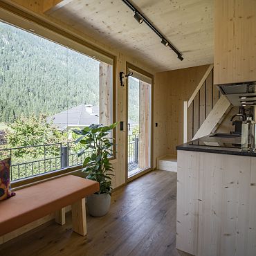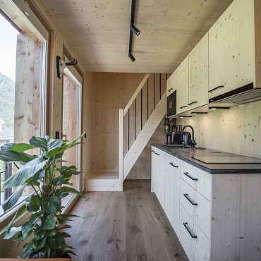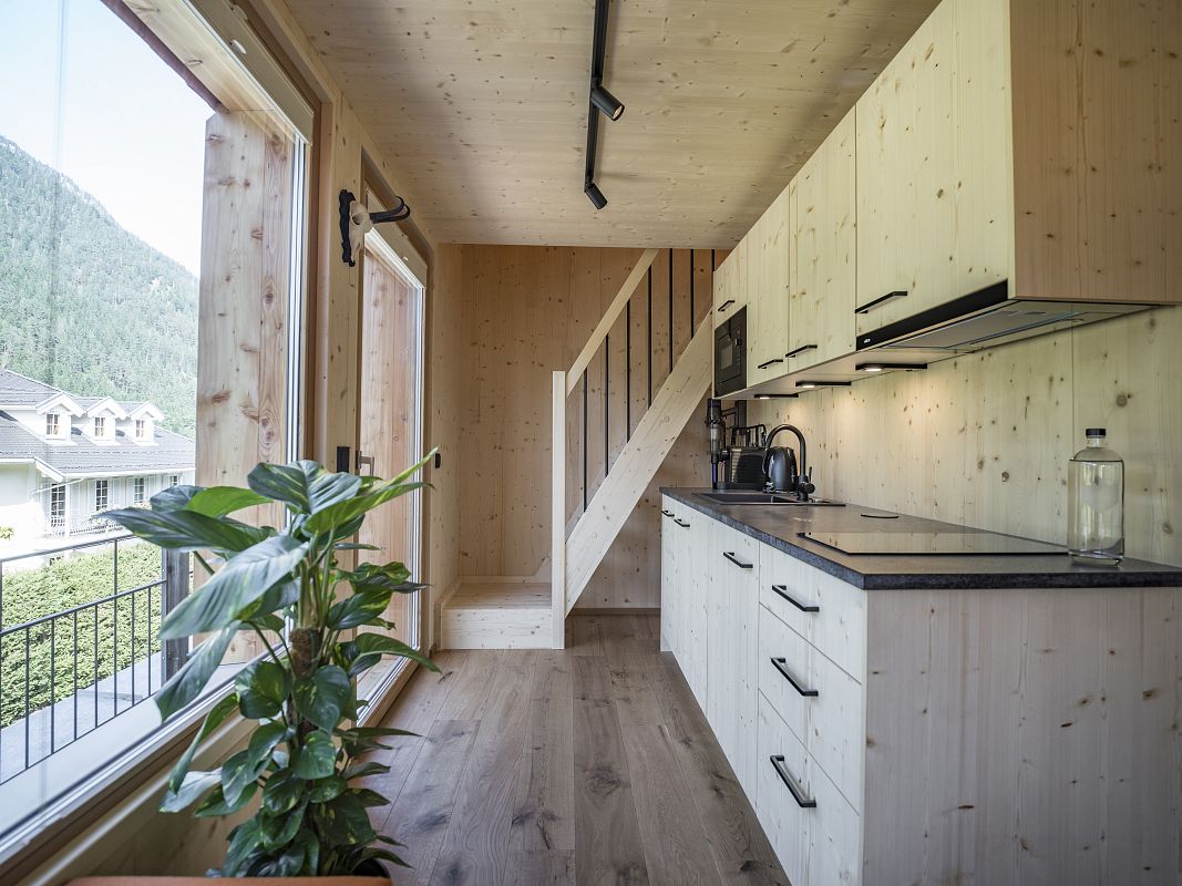 Das Tiny Chalet Kalipé ist offen gestaltet, mit großen Panoramafenstern, die das Draußen nach drinnen holen. Warmes Holzdesign, eine kleine, aber voll ausgestattete Küche und liebevoll ausgewählte Details machen den Raum heimelig und komfortabel.