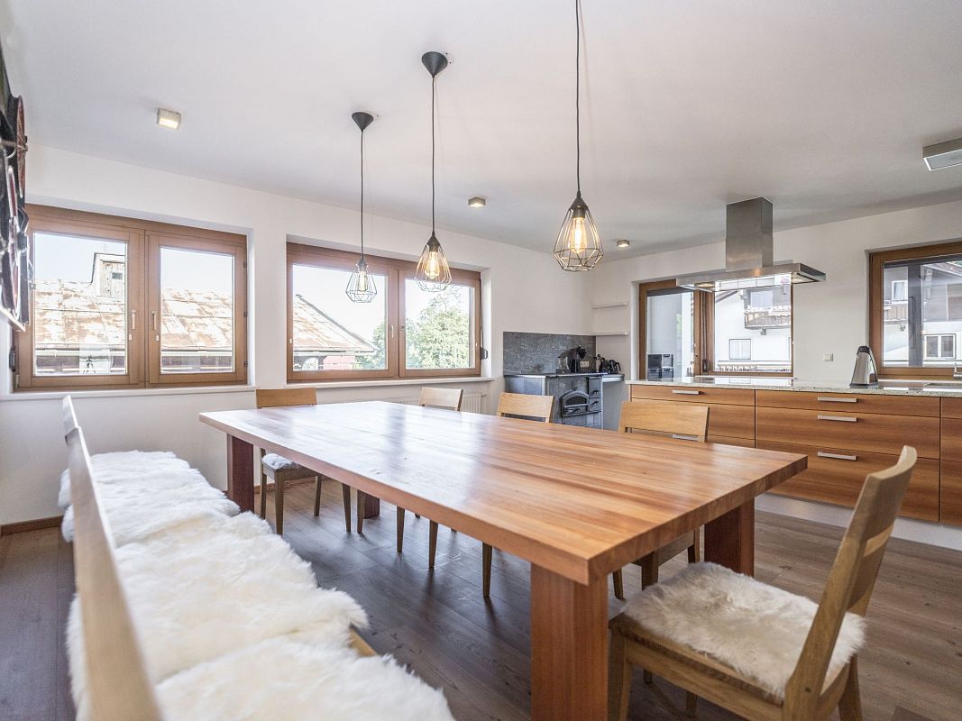 Discover everything you need for a laid-back vacation in Fieberbrunn at the spacious 170 m² XXL Suite Spielberg. The modern kitchen, featuring a stylish island, is perfect for social evenings, while the large dining table is ideal for cozy dinners and game nights with family and friends. Step out from the kitchen onto the balcony to enjoy the vibrant village atmosphere.The expansive living room offers